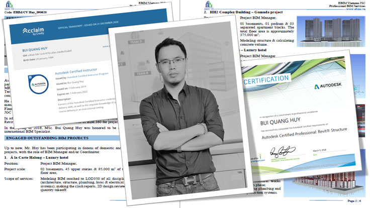 Trong hơn 10 năm qua, MSc CEM.ACI Bùi Quang Huy đã tham gia vào nhiều dự án có quy mô lớn trong nước và quốc tế với vai trò Quản lý/Điều phối BIM. Một số dự án nổi bật như: Khách sạn cao cấp À la Carte Hạ Long, Tổ hợp cao tầng Cap Saint Jacques, Chung cư cao tầng Florence, Tổ hợp HH2 Gamuda, Khu lưu trú cao tầng Flamingo, Chung cư cao cấp Westlake, Cảng hàng không quốc tế Cam Ranh, Khu nghỉ dưỡng Onsen Quang Hanh, Tòa tháp tài chính Vietinbank, Cảng hàng không quốc tế T2 Nội Bài, Nhà máy nước mặt Sông Đuống – GD1, Đầu tư xây dựng Cầu Hạc Trì, Chung cư siêu sang Palais de Louis…